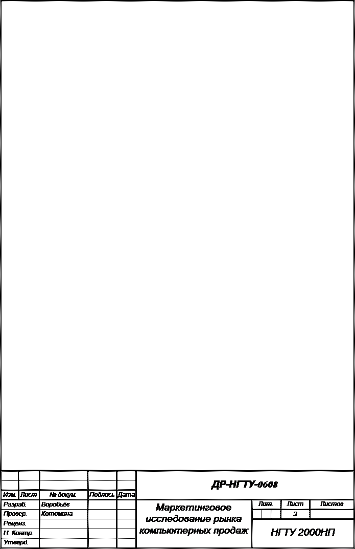НИЖЕГОРОДСКИЙ ГОСУДАРСТВЕННЫЙ ТЕХНИЧЕСКИЙ УНИВЕРСИТЕТ ПОЯСНИТЕЛЬНАЯ ЗАПИСКА к дипломной работе Воробьев Сергей Сергеевич(фамилия, имя, отчество) Факультет Социально-экономический Кафедра Экономики и предпринимательства Группа 2000-НП Дата защиты “ 20 ” июня 2003 г. МИНИСТЕРСВО ОБЩЕГО И ПРОФЕССИОНАЛЬНОГО ОБРАЗОВАНИЯ РОССИЙСКОЙ ФЕДЕРАЦИИ НИЖЕГОРОДСКИЙ ГОСУДАРСТВЕННЫЙ ТЕХНИЧЕСКИЙ УНИВЕРСИТЕТ Кафедра __________________Экономика и предпринимательство ______________________ Заведующий кафедрой __________________ Юрлов Ф.Ф. (подпись) (фамилия, и., о.) ________________________________ (дата) Маркетинговое исследование рынка компьютерных продаж (наименование темы проекта или работы) ПОЯСНИТЕЛЬНАЯ ЗАПИСКА _____________ К ДИПЛОМНОЙ РАБОТЕ_____________ _ _____________ ( вид документа – проект дипломный, курсовой, исследовательская работа или часть и т. п.) КОНСУЛЬТАНТЫ: РУКОВОДИТЕЛЬ 1. По ______________________________________ __________________ Котомина Н.Г. (подпись) (фамилия, и., о.) __________________ __________________ (подпись) (фамилия, и., о.) ________________________________ (дата) ________________________________ (дата) СТУДЕНТ 2. По ______________________________________ __________________ Воробьев_С.С. (подпись) (фамилия, и., о.) __________________ __________________ (подпись) (фамилия, и., о.) _____________________ (дата) ____2000-НП ____ (группа или шифр) ________________________________ (дата) 3. По ______________________________________ __________________ __________________ (подпись) (фамилия, и., о.) Проект защищен _____________________ (дата) __________________________________________ (дата) Протокол № ______________________________ РЕЦЕНЗЕНТ С оценкой ________________________________ __________________ __________________ (подпись) (фамилия, и., о.) ______________________________________________ _______________________________ (дата) г. Нижний Новгород 2003г.