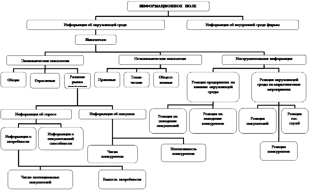 Рисунок 2 Основные направления маркетинговых исследований На практике применяют различные формы проведения маркетинговых исследований, классификация которых осуществляется по следующим критериям. 1 По виду объекта исследования - например, при исследовании рынка это исследование рынков сбыта, рынков производительных сил, рынка капитала и т.д.; исследование внутренней среды фирмы; исследование окружающей среды. 2 По территориальному признаку - например, при исследовании рынка это региональное, национальное, интернациональное исследование. 3 По временному признаку - например, для исследования рынка это ретроспективное, оперативное (текущее), диагностическое, прогнозное исследование. 4 По продуктивному (вещевому) признаку - например, для исследования средств производства, средств потребления, услуг. 5 По виду показателей, характеризующих объект исследования , которые делятся на объективные исследования, - например, для исследования сбыта это цена, объем продаж, структура спроса, и на субъективные исследования - например, для исследования сбыта это возраст, пол, профессия. 6 По способу получения данных и информации - первичные, полевые и вторичные, кабинетные, маркетинговые исследования. Приведенная классификация форм проведения маркетинговых исследований является рекомендательной. На практике возможны и другие формы маркетинговых исследований, которые могут быть опосредованы конкретной информационной системой, имеющей место при организации маркетинговой деятельности. Один из вариантов классификации информации об окружающей среде фирмы представлен на рисунке 3.