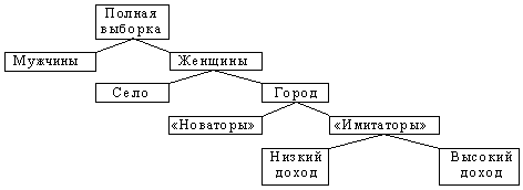 Принцип различия между сегментами означает, что в результате проведения сегментации должны быть получены различающиеся друг от друга группы потребителей. В противном случае, сегментация неявно будет подменена массовым маркетингом. Принцип сходства потребителей в сегменте предусматривает однородность потенциальных покупателей с точки зрения покупательского отношения к конкретному товару. Сходство потребителей необходимо для того, чтобы можно было разработать соответствующий маркетинговый план для всего целевого сегмента. Требование большой величины сегмента означает, что целевые сегменты должны быть достаточно большими для обеспечения продаж и покрытия издержек предприятия. При оценке величины сегмента следует учитывать характер продаваемого товара и емкость потенциального рынка. Так, на потребительском рынке количество покупателей в одном сегменте может измеряться десятками тысяч, тогда как на промышленном рынке большой сегмент может включать менее сотни потенциальных потребителей (например, для систем сотовой или спутниковой связи, для потребителей энергомашиностроительной продукции и т.д.). Измеримость характеристик потребителей необходима для целенаправленных полевых маркетинговых исследований, в результате которых можно выявлять потребности потенциальных покупателей, а также изучать реакцию целевого рынка на маркетинговые действия предприятия. Данный принцип крайне важен, так как распространение товара “вслепую”, без обратной связи от потребителей, ведет к распылению средств, трудовых и интеллектуальных ресурсов фирмы-продавца. Принцип достижимости потребителей означает требование наличия каналов коммуникации фирмы-продавца с потенциальными потребителями. Такими каналами коммуникации могут быть газеты, журналы, радио, телевидение, средства наружной рекламы и т.п. Достижимость потребителей необходима для организации акций продвижения, иначе информирования потенциальных покупателей о конкретном товаре: его характеристиках, стоимости, основных достоинствах, возможных распродажах и т.п. В основе процедуры сегментации рынка, наравне с применением принципов сегментации, лежит и обоснованный выбор соответствующего метода сегментации. 0.0.0. Методы сегментации Наиболее распространенными методами сегментирования рынка являются метод группировок по одному или нескольким признакам и методы многомерного статистического анализа. Метод группировок состоит в последовательной разбивке совокупности объектов на группы по наиболее значимым признакам. Какой-либо признак выделяется в качестве системообразующего критерия (владелец товара, потребитель, намеревающийся приобрести товар), затем формируются подгруппы, в которых значимость этого критерия значительно выше, чем по всей совокупности потенциальных потребителей данного товара. Путем последовательных разбивок на две части выборка делится на ряд подгрупп. На рисунке 0.0 представлена схема последовательных разбивок по методу AID (автоматического детектора взаимодействия), который получил широкое распространение в процедурах сегментации. Подобные методы перебора вариантов достаточно часто используются при сегментации рынка. Например, в исследовании Карпова подобный подход предложен как приоритетный метод выбора целевого рынка. Д