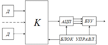 Рисунок 1 Схема состоит из источников сообщений в виде датчиков Достоинство этой схемы: простота и отсутствие служебной информации о номере передаваемого канала, т.к. в этом случае производится циклическая передача и нумерация каналов не нарушается. Недостатком схемы является невозможность получить высокий коэффициент сжатия по полосе и больший объём Возможны два варианта построения адаптивных РТМС с предварительным сокращением избыточной информации: 1. Устройство сокращения данных имеется в каждом измерительном канале. 2. Устройство сокращения данных находится после коммутатора или после АЦП. Рассмотрим первый вариант. 1.2 РТМС с адаптивной дискретизацией в каждом канале с буферной памятью В данной РТМС частота выдачи отсчета по каждому контролируемому параметру является функцией характера его изменения и определяется допустимой погрешностью измерения