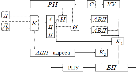 Рисунок 6 Отличительными особенностями этой системы являются: 1. Управление работой по программе или командам, передаваемым по обратному каналу. 2. Изменение частоты опроса коммутатора и связанное с этим сокращение объема вычислений. 3. Изменение структуры кода. 4. Возможность изменения программ измерений и алгоритмов сжатия данных при передаче. 5. Контроль переполнения БЗУ и изменение скорости считывания данных. Глава 2. РТМС с адаптивной коммутацией каналов 2.1 Обобщенная структурная схема Адаптивная коммутация представляет собой способ изменения частоты опроса источников информации в соответствии со скоростью изменения входного сигнала. Основной проблемой системы сжатия информации является объединение потоков отсчетов, идущих с различной частотой в единый поток, следующий с постоянной частотой, определяемой пропускной способностью КС. Очередность передачи информации от различных источников обычно производится в соответствии с такими характеристиками: - наибольшая текущая погрешность аппроксимации; - экстремальные значения входных сигналов или их производных; - отклонение параметров от нормы. Системы адаптивной коммутации позволяют учитывать приоритет отдельных сообщений по отношению к другим источникам.В системах адаптивной коммутации информация передается в КС в натуральном масштабе времени, т.е. без задержки, что является основным преимуществом таких систем. В данных системах производится предварительный опрос всех каналов, выявляется канал с наибольшей погрешностью аппроксимации, и информация этого канала поступает в линию связи. Рассмотрим обобщенную структурную схему системы (рисунок 7):