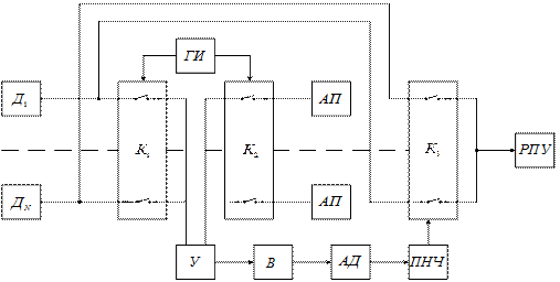 Рисунок 9 Для получения хороших результатов в этом случая необходимо, чтобы характеристики диодов были одинаковыми, поэтому применяют диодные сборки, а коэффициент усиления был не меньше 1000. Глава 3. РТМС с автоматическим регулированием частоты опроса датчиков В этих РТМС предусматривается возможность установления различной частоты опроса датчиков, например, в системе МКТ - 1. Так, при аварийных ситуациях увеличение частоты опроса датчиков позволяет получить более подробную измерительную информацию о происходящих в контролируемом объекте процессов. При ручном переключении частоты опроса датчиков есть значительная вероятность опоздать с этим переключением. Рассмотрим одну из возможных схем устройства для автоматического регулирования частоты опроса датчиков (рисунок 10). Сигнал от датчиков поступает на вспомогательный коммутатор К1 и коммутатор К2 . К коммутатору К2 , работающему синхронно и синфазно с коммутатором К1 , подключают генератор импульсов (ГИ). Частота генератора импульсов ГИ выбирается много больше, чем максимальная частота спектра сигнала.