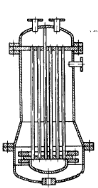 Поскольку сечения внутренней трубы и кольцевого зазора невелики, то в этих теплообменниках достигаются значительные скорости движения теплоносителей (до 3 м/с), что приводит к увеличению коэффициентов теплопередачи и тепловых нагрузок, замедлению отложения накипи и загрязнений на стенках труб. Однако двухтрубные теплообменники более громоздки, чем кожухотрубчатые, на их изготовление требуется больше металла на единицу поверхности теплообмена. Двухтрубные теплообменники применяют для процессов со сравнительно небольшими тепловыми нагрузками и соответственно малыми поверхностями теплообмена (не более десятков квадратных метров). Теплообменники типа «труба в трубе» используют для охлаждения или нагревания в системе жидкость—жидкость, когда расходы теплоносителей невелики и последние не меняют своего агрегатного состояния. Испарители и паропреобразователи Испарители применяются для испарения жидкости или для увеличения концентрации раствора путем испарения части растворителя. Испарители и парообразователи широко применяются для уменьшения и восполнения потерь конденсата. Их можно разделить на аппараты с естественной циркуляцией воды между трубками и с принудительной циркуляцией воды в кипятильных трубках. Давление с испарителя выбирается таким образом, чтобы обеспечивать нужную температуру кипения. Поскольку испарители часто работают под вакуумом, то температура в них ниже нормальной температуры кипения. В испарителях, в которых жидкость движется снизу вверх по вертикальным трубам, температура кипения жидкости внизу выше, чем вверху, из-за большего гидростатического давления. Таким образом, в нижней части труб кипение отсутствует и температура увеличивается до достижения температуры кипения, соответствующей локальному давлению. Затем возникает кипение вследствие большого подвода теплоты и мгновенного парообразования в перегретой жидкости, и температура уменьшается. Следовательно, разность температур в середине труб меньше, чем на концах, что может привести к значительному снижению характеристик в вертикальных испарителях (как с короткими, так и с длинными трубами), а также испарителях типа «корзины». Для повышения концентрации растворов необходимо учитывать рост температуры кипения при увеличении концентрации. В качестве примера испарителя воды с естественной циркуляцией на рис.7 представлен вертикальный аппарат. Коэффициент теплопередачи 3000-4000 Вт/м2 ∙К. Естественная циркуляция в этом аппарате происходит вследствие того, что образующаяся в кипятильных трубках пароводяная эмульсия имеет меньшую плотность, чем вода в кольцевом зазоре между корпусом и трубной системой, где ей сообщается значительно меньшее удельное количество тепла на единицу объема.
