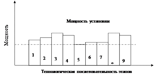 Рис.1.2.1. Профиль мощности установки Последний не остается постоянным, а изменяется в зависимости от технологии. Однако неиспользованная на каком-то этапе мощность не служит ни резервом мощности, ни экономическим резервом. Оптимальная мощность установки выбирается так, чтобы потери из-за неиспользованных резервов мощности с одной стороны и недополученная прибыль из-за неизготовленной продукции с другой были минимальными. Необходимо, однако, помнить, что при работе установки на предельной загрузке увеличиваются производственные расходы на единицу продукции из-за повышенного износа установки и возрастающих затрат энергии. С уменьшением загрузки установки увеличиваются постоянные издержки, например, удельные амортизационные расходы. И то, и другое отражается на затратах на единицу продукции (рис.2.1.2.)