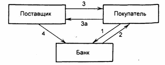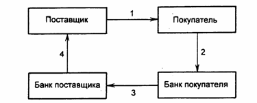 Рис. 1. Расчеты платежными поручениями при последующей оплате товаров (услуг): 1 - поставка товара (оказание услуг); 2 - передача платежного поручения в банк и списание средств со счета покупателя; 3 - перевод средств в банк поставщика и зачисление средств на счет получателя; 4 - сообщение поставщику о зачислении средств на его банковский счет Аккредитивная форма расчетов Сущность аккредитивной формы расчетов состоит в том, что плательщик поручает обслуживающему его банку произвести за счет средств, предварительно депонированных на счете, либо под гарантию банка оплату товарно-материальных ценностей по месту нахождения получателя средств на условиях, предусмотренных плательщиком в заявлении на открытие аккредитива. Аккредитив представляет собой условное денежное обязательство банка, выдаваемое им по поручению клиента в пользу его контрагента по договору, по которому банк, открывший аккредитив (банк-эмитент), может произвести поставщику платеж или предоставить полномочия другому банку производить такие платежи при условии предоставления им документов, предусмотренных в аккредитиве, и при выполнении других условий аккредитива. Существует несколько видов аккредитивов: 1) покрытые (депонированные) или непокрытые (гарантированные); 2) отзывные или безотзывные. Использование аккредитивов в международных расчетах регламентируется Унифицированными правилами и обычаями для документарных аккредитивов, утвержденных Международной торговой палатой в декабре 1993 г. Срок действия и порядок расчетов по аккредитиву устанавливается в договоре между плательщиком и поставщиком.