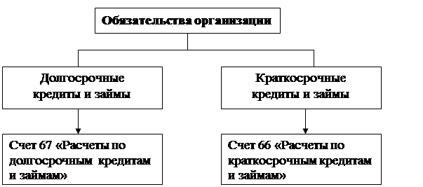Схема 1.2. Классификация кредитов и займов В бухгалтерском учете суммы полученных краткосрочных или долгосрочных кредитов и займов отражаются по кредиту счета 66 «Расчеты по краткосрочным кредитам и займам» (счета 67 «Расчеты по долгосрочным кредитам и займам») в корреспонденции со счетами учета денежных средств или со счетом 60 «Расчеты с поставщиками и подрядчиками» в момент их фактического получения. Возврат организацией-заемщиком полученного от заимодавца кредита, займа, включая размещенные заемные обязательства, отражается в бухгалтерском учете заемщика как уменьшение (погашение) указанной кредиторской задолженности. При погашении кредитов или займов на суммы погашаемых кредитов, займов дебетуются счета 66 или 67 в корреспонденции со счетами денежных средств (счета 50, 51, 52, 55). Следует иметь в виду, что сумма займа и сумма начисленных процентов в учете должны отражаться обособленно. С этой целью к счетам 66 «Расчеты по краткосрочным кредитам и займам» и 67 «Расчеты по долгосрочным кредитам и займам» целесообразно ввести субсчета следующим образом: 1 «Расчеты по выпущенным облигациям»; 2 «Расчеты по начисленным процентам». Информация о размешенных заемных обязательствах (обеспеченных векселями или облигациями) учитывается на счетах 66 или 67 отдельно по кредитам и займам, полученным под обеспечение ценных бумаг. Если облигации размещаются по цене, превышающей их номинальную стоимость, то делаются записи по дебету счета 51 «Расчетные счета» в корреспонденции со счетами 66 или 67 (по номинальной стоимости облигаций) и 98 «Доходы будущих периодов» (на сумму превышения цены размещения над номинальной стоимостью). Сумма, отнесенная на счет 98 «Доходы будущих периодов», списывается равномерно в течение срока обращения облигаций на счет 91 «Прочие доходы». Если облигации размещаются по цене ниже их номинальной стоимости, то разница между ценой размещения и номинальной стоимостью доначисляется равномерно в течение срока обращения облигаций с кредита счетов 66 или 67 в дебет счета 91 «Прочие доходы и расходы». В бухгалтерском учете операции по учету заемных средств отражаются проводками: Дебет 51 «Расчетные счета» Кредит 66 «Расчеты по краткосрочным кредитам и займам» - получена краткосрочная ссуда банка в виде денежных средств; Дебет 51 «Расчетные счета» Кредит 67 «Расчеты по долгосрочным кредитам и займам» - получена долгосрочная ссуда банка в виде денежных средств. Кредиты и займы, не оплаченные в срок, учитываются обособленно. Аналитический учет задолженности по полученным займам и кредитам ведется по видам займов и кредитам, кредитным организациям и другим заимодавцам. В учетной политике организации могут быть предусмотрены: перевод долгосрочной задолженности в краткосрочную задолженность; учет заемных средств, срок погашения которых превышает 12 месяцев, до истечения указанного срока учитывать в составе долгосрочной задолженности. В бухгалтерском учете операция по поводу долгосрочной задолженности в краткосрочную отражается записью с кредита счета 67 « Расчеты по долгосрочным кредитам и займам» в кредит счета 66 «Расчеты по краткосрочным кредитам и займам». Краткосрочная и/или долгосрочная задолженность может быть срочной и/или просроченной. Срочной считается задолженность по полученным кредитам и займам, срок погашен