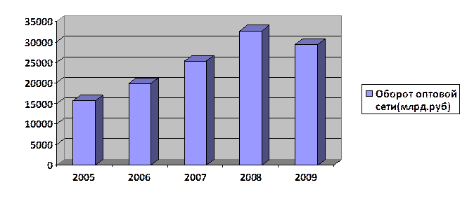 Исследуя данные розничного оборота за 2005-2009 года можно прийти к выводу, что он выше, чем в предыдущие года и предыдущие периоды. Оборот розничной торговли в России в 2008 г. составил 13 трлн. 914,6 млрд. руб., что на 28% больше по сравнению с показателем 2007 г. Однако 2009 год продемонстрировал отрицательную динамику. Прирост оборота розничной торговли в России в 2009 году снизился на 23,1% по сравнению с 2008 годом. Это может быть связано с экономическим кризисом в стране, который повлиял на покупательскую способность населения. Динамика оборота оптовой торговли. Таблица 2