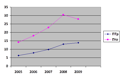 Рис 3.4. Динамика производительности труда розничной и оптовой торговли в фактических ценах за 2005 – 2009 г.