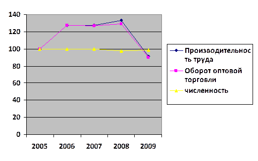 Рис 3.5. Зависимость темпа роста производительности труда от темпов роста среднесписочной численности работников торговли и товарооборота оптовой торговли.