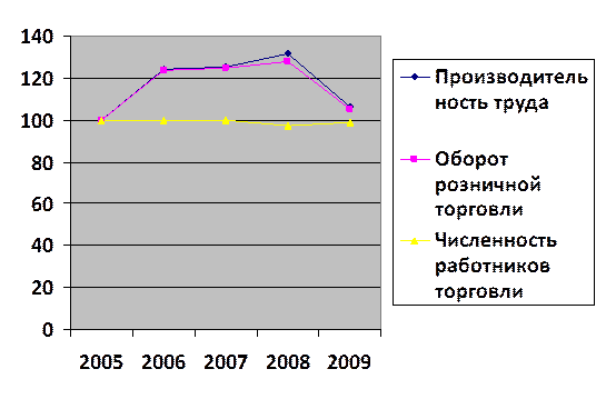 Рис. 3.3. Динамика численности населения занятого в торговле в сопоставимых ценах за 2005 – 2009 гг. Имея необходимые данные за 2005 – 2009 гг.., а именно розничный и оптовый товарооборот и среднесписочную численность занятых в торговле можно рассчитать производительность труда на одного среднесписочного работника по формуле:
