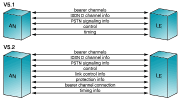 Рис 1. V5.1 и V5.2 Интерфейс V5.1 функционирует на одном потоке Е1 для каналов данных и каналов управления. Он поддерживает следующие услуги: связь с ТфОП, базовый доступ ISDN и выделенную линию. Каналы данных задаются заранее. Поэтому, этот интерфейс может поддерживать только до 30 каналов связи с ТфОП или 15 каналов базового доступа ISDN. Интерфейс V5.2 может функционировать на группе (до 16) потоков Е1. Поэтому, он может поддерживать до нескольких тысяч каналов данных. Это объясняется тем, что каналы данных распределяются динамически по запросу, а также поддерживается концентрация вызовов на группе потоков. Коэффициент концентрации обычно составляет примерно 8. Из-за возможного существования многочисленных каналов V5.2 обеспечивает идентификацию отдельных каналов, что позволяет проверить целостность потока. Отдельные потоки могут блокироваться для технического обслуживания или когда характеристики среды данных ниже удовлетворительных. Кроме того, этот протокол состоит из протоколов защиты, предназначенных для защиты звеньев сигнализации, посредством переключения канала управления из неисправного потока на другой исправный поток. Этот протокол поддерживает ISDN PRI в дополнение ко всем услугам, поддерживаемым V5.1. Основные различия между протоколами V5.1 и V5.2: 1. V5.2 состоит больше из служебных протоколов, а именно, протокола назначения канала (BCC - протокол), протокола защиты и протокола управления каналом. 2. V5.2 использует дополнительные резервные канальные интервалы для повышения безопасности связи. 3. V5.2 может поддерживать до 16 потоков Е1. Определены следующие функции связанные с переносом информации через интерфейс V5.2: - функции несущих каналов, которые обеспечивают двухскоростной перенос через интерфейс информации передаваемой/принимаемой пользователями по В-каналам портов ISDN или по каналам 64 кбит/с с портов ТфОП; - функции поддержки D-каналов ISDN, которые обеспечивают двухсторонний перенос через интерфейс информации D-каналов портов ISDN (сигнальной информации данных, передаваемых в пакетном режиме и данных, передаваемых в режиме трансляции данных); - функции поддержки сигнализации ТфОП, которые обеспечивают двухсторонний перенос сигнальной информации портов телефонной сети общего пользования; - функции управления портами, которые обеспечивают двухсторонний перенос через интерфейс управляющей и контрольной информации, связанной с блокировкой и разблокировкой отдельных пользовательских портов ISDNи ТфОП, а так же с рядом функций, специфических для портов ISDN (активизацией/деактивизацией доступа, индикацией ошибок, контролем характеристик работы: управлением потоком сигнальной информации; - функции общего управления, обеспечивающие управление реконфигурацией интерфейса, временную блокировку D-каналов отдельных портов ISDN в условиях перегрузки, рестарт протокола ТфОП и проверку согласованности обеих сторон интерфейса V5; - функции назначения канальных интервалов ИКМ-трактов для несущих каналов, предоставляемых пользователям, обеспечивающие концентрацию нагрузки. -функции защиты служебной информации, которые обеспечивают переключение логических каналов сигнализации и управления на резервные физические каналы при обнаружении отказов ИКМ-трактов, а также контроль ошибок протокола и перезапуск средств нумерации сообщений;
