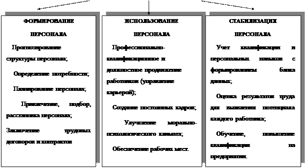 Рис1. Стадии системы управления персоналом Отклонение численности персонала в меньшую или большую сторону влияет на уровень трудового потенциала. Это значит, что как дефицит, так и излишек персонала одинаково отрицательно влияют на трудовой потенциал. Так, нехватка персонала приводит к чрезмерной нагрузке на работников, а содержание излишней численности ведет к недоиспользованию их индивидуального потенциала. Рассматривая процесс управления персоналом как целостную систему, можно выделить основные элементы, реализующие следующие функции: 1. организационную: · планирование источников комплектования кадрами; · информированность населения о наборе кадров и сроках набора; · объем средств, выделенных на подготовку кадров и жилищно-бытовое строительство, и др.; 2. социально-экономическую: · комплекс условий и факторов, определяющих использование и закрепление персонала; 3. воспроизводственную: · обеспечивающую создание учебно-материальной базы и развитие персонала. Структура управления персоналом включает в себя следующие направления деятельности: - планирование ресурсов – разработка плана удовлетворения потребностей в людских ресурсах и необходимых для этого затрат; - набор персонала – создание резерва потенциальных кандидатов по всем должностям; - отбор – привлечение наиболее подходящих кандидатов на рабочие места и отбор лучших из резерва, созданного в ходе набора; - определение заработной платы и компенсации – разработка структуры заработной платы и льгот в целях привлечения, найма и сохранения персонала; - профориентация – комплекс мероприятий, направленных на оказание помощи человеку в освоении своей профессии и ознакомление с перспективами трудовой деятельности; - социальная адаптация – взаимное приспособление работника и организации, для его врабатываемости в новых условиях; - обучение – разработка программ обучения персонала в целях эффективного выполнения работы и его продвижения; - оценка трудовой деятельности – разработка методик оценки трудовой деятельности и доведение ее до работника; - повышение, понижение, перевод, увольнение – разработка методов перемещения работников на должности с большей или с меньшей ответственностью, развития их профессионального опыта путем перемещения на другие должности или участки работы, а также процедур прекращения договора найма; - подготовка руководящих кадров, управление продвижением по службе –разработка программ, направленных на развитие способностей и повышение эффективности труда руководящих кадров; - занятость – разработка программ обеспечения равных возможностей занятости. Глава 2. Работа с персоналом. Конфликты и пути их разрешения Работа с персоналом – одна изосновных обязанностей руководителей всех направлений, которые должны придерживаться определенных правил:- ориентация на требования законодательства о труде; - учет текущих и перспективных потребностей организации в персонале, исходящих из задач ее развития; - соблюдение баланса интересов организации и ее работников; - создание условий для сокращения числа увольнений и сохранения занятости; - максимальная забота о каждом человеке, уважение его прав, свобод, достоинств. Руководить людьми легче тому, кто способен поставить себя на место другого человека и понять мотивы его поступков. 