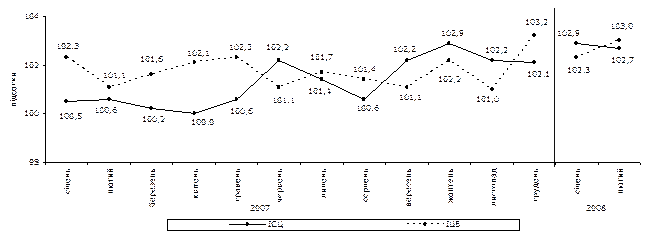 = Базовый индекс потребительских цен (БИПЦ) – это показатель, который характеризует инфляцию, которая вызвана давлением со стороны спроса, т.е. отображает эффекты от изменения реальных монетарных условий, фискальной политики, а также непредвиденных шоков спроса. Базовый индекс потребительских цен (БИПЦ) в декабре 2008г. составлял 102,0% , с начала года –103,6% . (Рис.1)