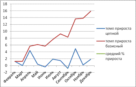 Наибольший дельный вес в общей структуре имеет показатель 4 квартала 0,26,а наименьший в первом. Показатели темпов роста увеличиваются с течением времени в большей степени. Базисные стабильно растут с каждым кварталом, а вот цепные снижают темпы рост в 3 квартале, но уже к 4 вновь начинают расти.