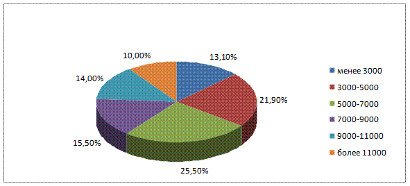 На рисунке 3 указано распределение выборки по группам в зависимости от уровня дохода на одного члена семьи в месяц. Как правило, посетители мебельных магазинов — лица со среднедушевым доходом свыше 1 500 руб. на члена семьи. При этом частота посещений, по-видимому, не зависит от того, насколько доход семьи превышает пороговую величину 1 500 руб. Рисунок 3. Распределение покупателей мебели по уровню дохода Люди с высшим образованием намерены покупать мебель почти в два раза чаще, чем лица со средним образованием и в четыре раза чаще, чем с образованием ниже среднего. Наибольший интерес в качестве целевой группы потенциальных покупателей вызывают руководители предприятий, организаций, учреждений, предприниматели, студенты, служащие и домохозяйки. Востребованность различных предметов мебели потенциальными покупателями Наиболее востребованный покупателями предмет мебели — стенка, в том числе «для кухни» — 31% от потенциальных покупателей, «для гостиной» — 27% и «для прихожей» — 14% (Приложение 4). Существенными параметрами, которыми руководствуется большинство покупателей при выборе мебели (кроме цены), являются цвет и материал. Сервисное обслуживание при покупке мебели считает очень важным моментом 41% опрошенных покупателей. Еще 37% респондентов склоняются к тому, что сервисное обслуживание скорее важно, чем не важно. Не очень важным и совсем не важным этот фактор является для 23% потенциальных покупателей (Приложение 5). Условия оплаты являются очень важным фактором для 40% покупателей и скорее важным, чем не важным — для 24%. Однако для 35% покупателей мебели условия оплаты не играют особой роли (Приложение 6). Таким образом, портрет потенциального покупателя продукции ООО «Сентябрь» выглядит следующим образом: - доход свыше 6000 на одного члена семьи; - возрастные характеристики позволяют выделить две группы потенциальных покупателей: молодежь до 30 лет (как правило, приобретает мебель впервые) и представители старшей возрастной группы (от 49 до 55 лет, высокий социальный статус, как правило, приобретают мебель с целью замены старой); - по половому признаку покупателями могут быть и женщины, и мужчины, однако существует некоторое преобладание женщин, которое объясняется традиционным распределением семейных обязанностей по созданию уюта в доме; - покупатели, как правило, имеют высшее образование; - сферы трудовой деятельности - различны; - основной объединяющий фактор – желание приобрести качественную мебель по доступной цене. Конкуренция на рынке производства и реализации мебельной продукции достаточно высока. С одной стороны конкурентами являются фирмы, которые как производят, так и реализуют свою продукцию, с другой стороны, в число конкурентов входят и фирмы, занимающиеся только торговлей мебелью. Основными конкурентами ООО «Сентябрь» являются: ООО «Орион», ООО «Стиль», ООО «Континент». Приведем их краткую характеристику. ООО «Орион» имеет три магазина в различных частях г. Нижнего Новгорода. Увеличение объема сбыта достигается путем открытия магазинов в разных районах города. Фирма предоставляет право выбора материала обивки, варианта комплектации. Цены выше, чем у ООО «Сентябрь». Фирма «Орион» участвует в мебельных выставках. Бесплатной доставки мебели нет. ООО «Стиль имеет два салона в г. Нижний Новгород. Фирма предоставляет 