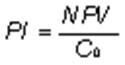 где Bt - выгоды проекта в год t Ct - затраты проекта в год t t = 1 ... n - годы жизни проекта Инвестору следует отдавать предпочтение только тем проектам, для которых NPV имеет положительное значение. Отрицательное же значение свидетельствует о неэффективности использования денежных средств: норма доходности меньше необходимой. - Индекс прибыльности. Индекс прибыльности (profitability index, PI) показывает относительную прибыльность проекта, или дисконтированную стоимость денежных поступлений от проекта в расчете на единицу вложений. Он рассчитывается путем деления чистых приведенных поступлений от проекта на стоимость первоначальных вложений: Формула (3).