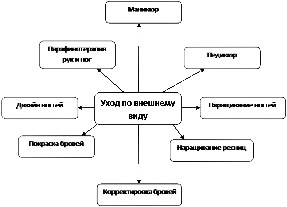 Рисунок 1 – Виды услуг 1 Различные виды услуг: - Маникюр – Уникальный восстанавливающий и увлажняющий эффект горячего маникюра можно сравнить с эффектом парафинотерапии, но, в отличие от парафинотерапии, горячий маникюр не имеет противопоказаний. Как известно, людям с поврежденной кожей рук, на которой имеются микротравмы, трещины или цыпки, нельзя использовать горячие парафиновые ванны, а вот теплые кремовые или масляные ванночки в таких случаях использовать можно и даже нужно. - Педикюр – Для проведения этих процедур используются самая современная косметика, содержащая природные компоненты - термальная вода, грязи, водоросли, растительные экстракты. Для расслабления стоп и подготовки их к основной процедуре педикюра, применяют гидромассажные ванны с морскими солями. Это помогает хорошо смягчить кожу стоп. Далее стопы и ногти обрабатывают шлифовальным аппаратом, который безболезненно и эффективно удаляет натоптыши и мозоли, а также превосходно выравнивает поверхность ногтей. После обработки шлифовальным аппаратом на кожу стоп наносят специальный состав, предотвращающий появление новых мозолей. Размягчению кожи стоп и пяток способствует применение фруктовых кислот. А для очистки стоп успешно применяются крупные и мелкие скрабы. - Наращивание ногтей – это искусственное удлинение ногтя с помощью специальных материалов, которые не только удлиняют ноготь, но и укрепляют его структуру. Первый реальный факт о наращивании ногтей гелем, акрилом или шелком свидетельствует о том, что, несмотря на все уверения специалистов, ногтевая пластинка натурального ногтя под слоем затвердевшего акрила, геля или шелка на самом деле не дышит (особенно в случае наращивания с помощью типсов — искусственных ногтей, наклеиваемых на натуральные), а если и дышит (в случае с формами, которые только крепятся на кончик ногтя), то недостаточно. Второй реальный факт о наращивании ногтей гелем, акрилом или шелком заключается в том, что при грамотном наращивании ногтей возникновение грибков и бактерий между натуральными и искусственными ногтями исключено. Ну, и третий реальный факт о наращивании ногтей гелем, акрилом или шелком гласит, что при использовании качественных акриловых или гелевых материалов, не содержащих в себе метилметакрилат (ММА), наращивание ногтей является абсолютно безопасной для здоровья женщины процедурой. - Наращивание ресниц – мастер при помощи специального пинцета приклеивает искусственные ресницы к основанию ваших родных ресниц. По большому счету, наращивание ресниц это тоже самое, только крепятся они не все сразу, а по одной или маленькими пучками. Процедура наращивания ресниц состоит из нескольких этапов. Сначала мастер при помощи специального средства должен снять с вас макияж и заодно обезжирить кожу век. Затем вы должны будете выбрать цвет и длину ваших будущих ресниц, после чего и начинается процедура наращивания. - Корректировка бровей – удаление волосков по определенной форме. Сначала мастер дезинфицирует брови клиента и щипцы для работы. Далее происходит удаление волос (при надобности и стрижка) по форме, выбранной клиентом. После этой процедуры необходимо смазать брови увлажняющим кремом. Корректировку бровей необходимо осуществлять 1или 2 раза в неделю по мере прорастания волосков. - Покраска бровей –