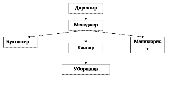 Рисунок 6 – Организационная структура управления Структура управления – линейная, обеспечивает единство и чёткость принятия решений, простоту управления оперативность принятия решения. Для специалистов центра обязательным иметь опыт работы. Оплата производится в соответствии с контрактом по окладу. Все специалисты работают на основе контракта. Оплата производиться в соответствии с контрактом по окладу. Обязанности сотрудников фирмы Директор: - организация рекламной компании; - координация работы сотрудников фирмы; - принятие решений о приёме и увольнении сотрудников; - принятие решений о материальном поощрении, взыскании; - принятие решений об отпусках, декретных отпусках, больничных и т. д.; - приём и рассмотрение поступающих жалоб и предложений; - рассмотрение вопросов по приобретению необходимого оборудования. Кассир: - приём поступающих заявок на услуги; - приём взносов от клиентов и их регистрация; Менеджер: - обязанность знать прайс-лист, основные технологические ограничения, ассортимент, характеристику назначения; - подготовка заказов, дозаказов и рекламаций; - сохранность принятых денег от заказчика до момента передачи администратору; - контроль по соблюдению правил пожарной безопасности; - ответственность за рекламу салона. Бухгалтер: - ведение бух. учёта, учёта имущества, обязательств и хозяйственных операций; - составление отчётных калькуляций себестоимости продукции, работ и услуг; - выявление источников потерь и не производственных затрат; - начисление и перечисление налогов. Маникюрист: - выполнение различных видов услуг; - выполнение требований по культуре обслуживания; - консультирование любого желающего клиента; - поддержание в чистоте и порядке необходимого оборудования и материалов. Уборщица: - выполнение влажной, ежедневной уборки помещений фирмы; - чистка и мытьё санузла. Для получения прогрессивного результата от деятельности салона, мастера должны быть высоко квалифицированными работниками, стаж работы – не менее трех лет в данной отрасли. Таблица 9 – Затраты на электроэнергию