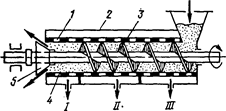 где Согласно уравнению (1) количество жидкости, выделяемой при прессовании, прямо пропорционально перепаду давлений и размеру капилляров и обратно пропорционально вязкости жид-. ми т и длине капилляра. Следовательно, более полному отжатию жидкостиспособствует увеличение давления и уменьшение вязкости жидкости. Однако чрезмерное увеличение давления уменьшает сечение капилляров, а следовательно, и производительность пресса. Поэтому оптимальное рабочее давление при прессовании устанавливают опытным путем с учетом структурно-механических свойств материала, количества и качества получаемой жидкости. Для обеспечения наиболее полного выделения жидкости при отжатииисходный материал зачастую подвергают измельчению и обработке термической, а иногда и электрической. Для уменьшения вязкости жидкости прессуемый материал часто нагревают до температуры, допустимой технологическими условиями. Сложность и недостаточная изученность явлений, происходящих при отжатии, разнообразие сырья и методов его предварительной обработки не дают возможности предложить единое уравнение для расчета выхода жидкости. Такие зависимости пока определяют опытным путем. Хотя уравнение (1) и не учитывает ряда факторов, связанных с деформацией прессуемой массы, ее пористостью и толщиной слоя, и не является расчетным, вместе г тем оно позволяет наглядно анализировать процесс по входящим в него величинам. Машины для отжатая жидкости (прессы). По принципу действия различают прессы периодического и непрерывного действия, по способу создания рабочего давления — прессы механические и пневматические. Широко применяются в промышленности шнековые и вальцовые прессы непрерывного действия, а также пневматические и корзиночные прессы периодического действия. Шнековые прессы. Устройство горизонтального шнекового пресса показано на рис. (1). В перфорированном цилиндре 1 , помещенном в горизонтальном корпусе 2, расположен шнек 3 с уменьшающимся шагом, который предназначен как для транспортировки материала, так и для отжатия из него жидкости. Выделяемая при этом жидкость различной мутности отводится в виде I, II и III фракций через отверстия в основании корпуса. Окончательное извлечение жидкости достигается в. камере давления 4.