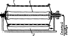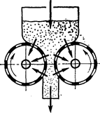 Рис. 3. Схема действия вальцового пресса В пневматическом прессе (рис. 2) давление на прессуемый материал создается с помощью сжатого воздуха, увеличивающего объем цилиндра 2 из листовой резины. Благодаря этому при получении, например, виноградного сока прессуемый материал не перетирается, не нарушается механическая структура кожицы, гребней и семян и сок получается высокого качества. Загрузка и разгрузка барабана 1 производится через люки, установленные по длине. При работе прессов производят несколько рыхлении материала путем вращения барабана, предварительно выпустив воздуха из цилиндра. Выделенный сок вытекает через отверстия в барабане в поддон 3, а из него — в сборник. Вальцовый пресс (рис. 3), применяемый для отжатия жидкости из картофельной мезги при производстве крахмала, состоит из двух полых перфорированных валков, вращающихся навстречу один другому. Отжатая из мезги жидкость проходит через отверстия внутри валков и затем отводится из них, а мезга продавливается вниз. 3. Формование пластических материалов При помощи формовки пластическим материалам придают необходимую форму. Этот способ обработки используют для формовки хлебопекарных дрожжей, приготовления из теста хлебобулочных, макаронных, кондитерских и других изделий. Например, тесто относится к упругопластическим и вязким материалам, способным сохранять свои свойства до определенного предела. За этим пределом тесто начинает необратимо деформироваться и течет, как вязкая жидкость. Это наступает тогда, когда приложенные силы превосходят сопротивление структуры упругой системы. Прессы, применяемые для формовки материалов, в зависимости от способа деист. вия подразделяются на нагнетающие, закаточные и штампующие. Нагнетающие прессы широко применяются для формования макарон, вермишели, лапши, дрожжей и др. Такие прессы состоят из нагнетающего устройства и формующей матрицы (мундштука) с отверстиями нужного сечения и размеров. Шнековый пресс для изготовления макарон, вермишели и лапши, показанный на рис. VI—4 состоит из тестосмесителя 1 , нагнетающего шнека 2 и прессовой головки 3, обеспечивающей равномерное давление теста на матрицу 4. В нем нагнетающим шнеком тесто продавливается через матрицу с получением продукта определенного сечения и формы. Матрицу часто изготовляют из латуни или бронзы; в последнее время в нее вставляют вкладыши из фторопласта, к которому тесто не прилипает. Закаточные прессы или машины (рис.5) применяются для придания тесту округлой формы. Это достигается прокатыванием