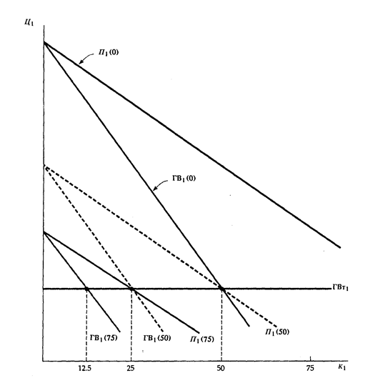 МАЛ. 1.1. Рішення фірми № 1 щодо обсягу виробництва. Вибір фірмою № 1 обсягу виробництва, що максимізує прибуток, залежить від того, скільки, на її думку, вироблятиме фірма № 2. Якщо, на думку фірми № 1, фірма № 2 нічого не вироблятиме, то крива попиту на товари фірми № 1 — це крива ринкового попиту. Відповідна крива граничної виручки позначена ГВ1 (0), і вона перетинає криву граничних витрат ГВт на рівні випуску 50 одиниць. Якщо, на думку фірми № 1, фірма № 2 вироблятиме 50 одиниць, то її крива попиту П1 (50) зміщується ліворуч на цю величину. Відповідною кривою граничної виручки тепер є ГВ1 (50). Максимізація прибутку тепер передбачає випуск 25 одиниць. П1 (75) і ГВ1 (75) — це криві попиту та граничної виручки для фірми № 1 тоді, коли, на її думку, фірма № 2 вироблятиме 75 одиниць. Тоді фірма № 1 вироблятиме лише 12,5 одиниць. Суть моделі Курно полягає в тому, що кожна фірма розглядає рівень виробництва свого конкурента як фіксований, а потім вирішує, скільки потрібно виробляти. Щоб побачити, як діє ця модель, розглянемо, як приймає виробниче рішення фірма № 1. Припустимо, на думку адміністрації фірми № 1, фірма № 2 нічого не вироблятиме. Тоді крива попиту на товар фірми № 1 — це крива ринкового попиту. На мал. 1.1 вона показана кривою П