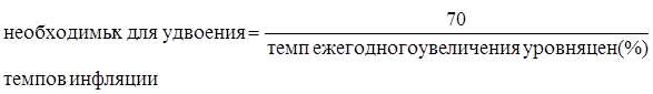 Так называемое «правило величины 70» дает нам другую возможность количественно измерить инфляцию. Точнее говоря, оно позволяет быстро подсчитать количество лет, необходимых для удвоения цен. Надо только разделить число 70 на ежегодный уровень инфляции: Приблизительное кол-во лет