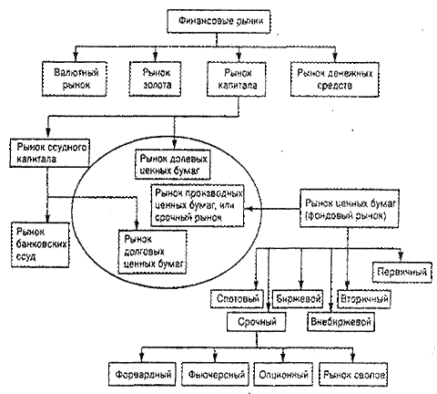 Рис.1 Классификация финансовых рынков Ниже дается краткая характеристика приведенных на схеме рынков. Валютный рынок — это рынок, на котором товаром являются объекты, имеющие валютную ценность. К валютным, ценностям относятся: • иностранная валюта (денежные знаки (банкноты, казначейские билеты, монеты, являющиеся законным платежным средством или изымаемые, но подлежащие обмену) и средства на счетах в денежных единицах иностранного государства, международных или расчетных денежных единицах); • ценные бумаги (чеки, векселя), фондовые ценности (акции, облигации) и другие долговые обязательства, выраженные в иностранной валюте; • драгоценные металлы (золото, серебро, платина, палладий, иридий, родий, рутений, осмий) и природные драгоценные камни (алмазы, рубины, изумруды, сапфиры, александриты, жемчуг). В качестве субъектов (участников) валютного рынка выступают: банки, биржи, экспортеры и импортеры, финансовые и инвестиционные учреждения, правительственные организации. Объект валютного рынка (на кого направлены действия субъекта) — любое финансовое требование, обозначенное в валютных ценностях. Объекты валютного рынка покупаются и продаются субъектами валютного рынка за деньги, находящиеся в обращении. Субъекты валютного рынка осуществляют следующие виды операций: передача покупательной способности, хеджирование (страхование открытых валютных позиций), спекуляция (выгода от ожидания изменений валютных курсов или процентных ставок), арбитраж процентных ставок (получение выгоды от принятия депозитов и их переразмещение на согласованные периоды по более высокой ставке). При проведении операций с объектами валютного рынка (валютных операций) субъекты действуют не только с точки зрения экономической целесообразности, но и в определенном поле организационных, экономических и правовых ограничений. Такую совокупность взаимоотношений можно назвать системой валютно-финансовых отношений. Рынок золота — это сфера экономических отношений, связанных с куплей-продажей золота как с целью накопления и пополнения золотого запаса страны, так и для организации бизнеса и (или) промышленного потребления. Финансовый рынок развитых экономик можно подразделить на денежный рынок и рынок капитала. Под денежным рынком понимается рынок краткосрочных кредитных операций. В практике развитых стран считается, что если срок обращения финансового инструмента составляет менее года, то это инструмент денежного рынка.[5] Рынок капиталов охватывает средне- и долгосрочные кредиты, а также акции и облигации. Он подразделяется на рынок ценных бумаг и рынок средне- и долгосрочных банковских кредитов. Рынок капиталов служит важнейшим источником долгосрочных инвестиционных ресурсов для правительств, корпораций и банков. Если денежный рынок предоставляет высоко ликвидные средства в основном для удовлетворения краткосрочных потребностей, то рынок капиталов обеспечивает долгосрочные потребности в финансовых ресурсах. Финансовый рынок можно рассматривать и как совокупность первичного и вторичного рынков, а также национальный и международный. Первичный рынок возникает в момент эмиссии ценных бумаг, на нем мобилизуются финансовые ресурсы. На вторичном рынке эти ресурсы перераспределяются, и даже не один раз. В свою очередь, вторичный рынок под