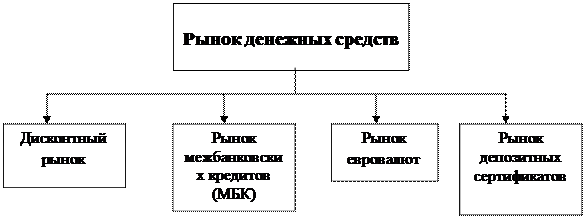 Рис. 2. Основные сегменты рынка денежных средств. Прежде всего, следует упомянуть о дисконтном рынке как обобщающей характеристике рынка, на котором продаются и покупаются векселя. Этот рынок играет особую роль в денежно-кредитном регулировании экономики, а его значение заключается в обеспечении равномерного притока денег в экономику. Операторами дисконтных рынков являются центральный банк и коммерческие банки. Денежный рынок подразделяется на обычный, учетный, межбанковский и валютный рынки. К учетному рынку относят тот, на котором основными инструментами являются казначейские и коммерческие векселя, другие виды ценных бумаг, главная характеристика которых - высокая ликвидность и мобильность. Межбанковский рынок - часть рынка ссудных капиталов, где временно свободные денежные ресурсы кредитных учреждений привлекаются и размещаются банками между собой, преимущественно межбанковских депозитов на коротких сроках . Межбанковские кредиты предоставляются в форме продажи излишка средств коммерческого банка на резервном счете в центральном банке сверх определенной законом величины обязательных резервов и в форме сделок «РЕПО». Валютные рынки обслуживают международный платежный оборот, связанный с оплатой денежных обязательств юридических и физических лиц разных стран. Специфика международных расчетов заключается в отсутствии общепринятого для всех стран платежного средства. Поэтому необходимым условием расчетов по внешней торговле, услугам, инвестициям, межгосударственным платежам является обмен валюты на другую в форме покупки или продажи иностранной валюты плательщиком или получателем. Валютные рынки - официальные центры, где совершается купля-продажа валют на основе спроса и предложения. Рынок евровалют представляет собой часть денежного рынка, на котором осуществляется торговля краткосрочными финансовыми инструментами, номинированными в евровалютах. В развитых странах существует также рынок депозитных сертификатов. Депозитные сертификаты представляют собой свидетельства о крупных срочных вкладах в банках и являются ценной бумагой. Поскольку срок обращения депозитных сертификатов, как правило, не превышает один год, эти бумаги можно рассматривать как бумаги денежного рынка. Евровалюта — общее понятие для обозначения валют, которые имеют хождение вне страны-эмитента, т.е. широко используются на международных рынках при кредитных, депозитных и иных операциях. В первую очередь к этим валютам относят доллар США, немецкую марку, фунт стерлингов и некоторые другие общепризнанные валюты. Примером инструментов, обращающихся на рынках евровалют, являются синдицированные кредиты сроком от 3 до 6 месяцев, предоставляемые синдикатами банков из разных стран в одной из евровалют. Часть финансовых инструментов, номинированных в евровалюте, например еврооблигации, относится большей частью к рынкам капиталов. В рассмотренной выше классификации финансовых рынков отсутствуют рынок страховых полисов и пенсионных счетов, а также ипотечные рынки. Это особые рынки со своими финансовыми инструментами и институтами - сберегательными учреждениями, действующими на договорной основе. Инвестиционная политика страховых компаний и пенсионных фондов направлена на приобретение долгосрочных финансовых инструмен