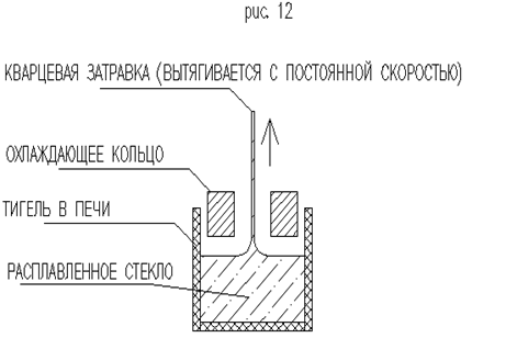 После стадии осветления стекло должно храниться до загрузки в установку для вытягивания волоконных световодов в виде заготовок некоторой формы. Наиболее удобный способ получения таких заготовок - вертикальное вытягивание стержней из расплава, содержащегося в тигле (рис.12). Стержни формируются посредством погружения затравочного стержня в расплав и медленное вытягивание его верх сквозь охлаждающее кольцо. Загустевшее стекло вытягивается вслед за затравочным стержнем и застывает в форме прута диаметрои 5-10 мм. Длина прута – несколько метров. В виде прутьев стекло сохраняется в чистых комнатах или в иных стерильных условиях (кварцевых трубках).