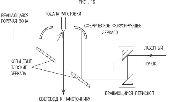 В идеале зона нагревания должна быть хорошо контролируема и минимальна по размерам. Таким требованиям удовлетворяет лазерное плавление (рис.16). Мощность лазерного луча достаточно легко контролировать, следовательно, легко контролировать скорость и область плавления волокна. Лазерный луч падает на вращающейся зеркальный перископ так, что выходящий пучок сканирует по образующей цилиндра диаметром несколько сантиметров, попадает на наклонное зеркало с отверстием в центре, через которое пропускается световодное волокно. Затем сканирующий пучок с помощью вогнутого зеркала сводится во вращающееся фокальное пятно в фиксированной точке у конца заготовки, где образуется луковица. При условии, что заготовка точно центрирована относительно фокальной точки оптической системы, луковица однородно нагревается со всех сторон и сильно уменьшается благодаря тому, что сфокусированный пучок очень узок. Подобная вытяжная установка позволяет справиться с переходными флуктуациями диаметра волоконного световода, характерными для вытяжных установок с протяженной горячей зоной и возникающими из-за механического дрейфа положения луковицы. 3.2.4 Приемное устройство. Наиболее простая конструкция приемного устройства – барабан для намотки волоконного световода. Барабан приводится во вращательное и одновременно с тем поступательное движение прецизионными приводами. Постоянная скорость поступательного движения обеспечивает намотку с постоянным шагом. При шаге 200 мкм (50 витков на сантиметр) на барабане диаметром 25 см 1 километр световода займет 25 -30 см длины барабана при однослойной намотке. Если использовать барабан длинной 1м, то при непрерывном процессе протягивания в одном слое уместиться 15 километров световода. Скорость намотки постоянна, но задается до начала протягивания; значение скорости варьируется от 1 км / ч до 1 км / мин. Для хорошего контроля скорости барабан должен быть точно сбалансирован по своей оси. Поверхность барабана должна быть гладкой. Чтобы предотвратить намотку волокна на барабан в натянутом состоянии (и возникновение вследствие этого микротрещин и микроизгибов волокна) барабан охлаждают. Либо на время намотки барабан нагревают до температуры, большей чем температура окружающей среды, равная температуре наматываемй оптической жилы. Нагретый барабан предотвратит натяжение волокна. Другой способ вытягивания волокна - применение кабестана (тянущего ролика). Световод в таком случае прижимается вспомогательным роликом к прецизионному колесу тянущего ролика, охватывая его. В таком случае можно осуществить точный контроль скорости вытягивания световода и обеспечить непрерывное вытягивание (даже если в дальнешем наматываются короткие отрезки на разные катушки), исключив остановки и запуски, связанные со сменой катушек и неизбежно вызывающие некоторые колебания размеров вытягиваемого световода при каждом переключении. Используя роликовый приемно-вытяжной механизм, можно связать вытяжную установку непосредственно с экструзионной (выдавливающей) линией для покрытия световода упрочняющим материалом либо электролитической ванной для покрытия слоем металла. Затем можно провести многослойную намотку очень длинных световодов на катушку с фланцами. Пока световод не имеет покрытия, лучше ограничится одно
