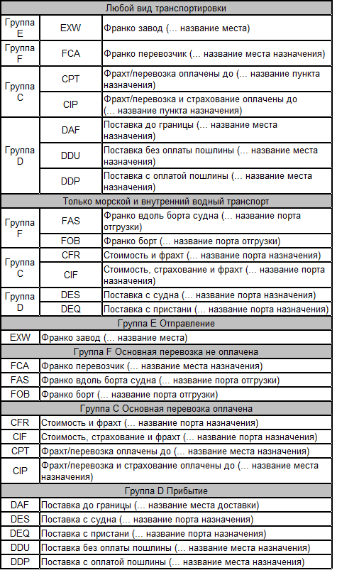 1. Франко-завод или с завода (Ex works). При этом базисном условии на продавце не лежит никаких обязанностей по транспортировке товара. Он должен предоставить товар в распоряжение покупателя в срок и в месте, обозначенном в контракте на предприятии, заводе, складе и т. д. Покупатель несет все риски и расходы после передачи товара. Для продавца это способ продать товар с наименьшим риском. 2. Франко-перевозчик (с указанием пункта) FCA (Free carrier) — условие поставок, которое применяется при перевозке грузов любым видом транспорта. Перед непосредственной погрузкой на транспортное средство продавец обязан сдать товар, прошедший таможенную очистку, перевозчику либо другому лицу, указанному покупателем, например, экспедитору. Передача товара производится в установленный день или период времени в указанном пункте. Если же покупатель не назвал такой пункт, продавец выбирает его сам. Обязанности по погрузке товара возложены на продавца (в ред. Incotermes-2000). 3. "Свободно вдоль борта судна" FAS (ФАС) (Free along side ship) — условие контракта, которое применяется только при морских перевозках. Продавец обязан за свой счет доставить товар в порт погрузки, указанный в контракте, оплатить все расходы в порту и расположить товар на причале или на лихтерах вдоль борта судна, зафрахтованного покупателем и в установленную дату или срок. Покупатель должен заключить договор перевозки (зафрахтовать судно), внести провозную плату и заблаговременно известить продавца о месте подаче груза, а также погрузить товар на борт судна. “Incotermes-2000” возлагает на продавца также выполнение таможенных формальностей, необходимых для вывоза товара. С этого момента расходы и риски случайной гибели и случайного повреждения товара переходят с продавца на покупателя. 4. ФОБ — свободно на борту судна (наименование порта отгрузки), FOB (Free on board). Это условие применяется при морских перевозках. По нему продавец обязан за свой счет поставить товар на борт судна, зафрахтованного покупателем, в установленный срок в согласованном порту погрузки. Продавец должен известить об этом покупателя и передать ему документы, включая коносамент. Покупатель заключает договор перевозки, извещает продавца о названии судна, месте погрузки, необходимой дате поставки и несет все расходы, падающие на товар, с момента фактического перехода товара через поручни судна в указанном порту отгрузки. Экспортные таможенные формальности осуществляет продавец за свой счет. Риск случайной гибели или порчи товара переходит с продавца на покупателя в момент фактического пересечения товаром поручней судна в согласованном сторонами порту погрузки. 5. Стоимость и фрахт (наименование порта назначения) CFR (cost and freight) — условие, применяемое при перевозке товаров лишь морским транспортом. По этому условию продавец обязан за свой счет зафрахтовать судно, оплатить стоимость фрахта до согласованного порта назначения и погрузить товар на борт судна в порту отправления. Это означает, что в уплачиваемую покупателем цену входят стоимость товара и фрахт. Расходы по выгрузке товара в порту разгрузки несет покупатель. обязан выполнить все таможенные формальности, необходимые для вывоза. Риск случайной гибели товара при условии "стоимость и фрахт" переходит с продавца на покупателя в момент фактического перехода товара через поручни суд