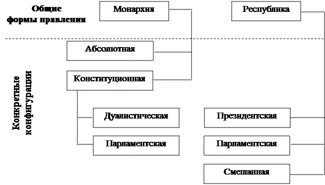 Аристотель полагал, что монархия способна выродиться в тиранию, аристократия – в олигархию ради выгоды богатых, а политейя может ориентироваться только на пользу бедных, потому ни одно из выделенных им правлений не занимается всеобщим благом. Философ видел лучшую («правильную») власть в смешении всех трех форм в их умеренном виде и в зависимости от реальной ситуации.[7] Так же среди форм правления выделялись диктатура (лат. dictatura– неограниченная власть), охлократия (гр. ochtos– чернь, толпа), тимократия и пр. Современная теория государства различает два основных вида форм правления – монархия и республика. Типология современных форм правления представлена на рис. 1 Рис. 1 – Типология современных форм правления 2. Современные формы правления 2.1. Монархическая форма правления 2.1.1. Понятие монархии. Виды монархии Монархия – это исторически сложившаяся форма правления, при которой во главе государства стоит, как правило, единоличный монарх (король, царь, император, шах, калиф, герцог, султан и т.д.), являющийся источником верховной власти, либо наделенный другими органами государства или гражданами, властью соразмерной верховной, и, занимающий престол в соответствии с наследственным или выборным принципом, юридически не отвечающий за свои действия и осуществляющий функции государственного управления в рамках и на основе монархического правосознания народа.[8] Монархия в переводе с греческого языка означает «единовластие», «единодержавие». Вмонархии формальным источником власти является одно лицо. Глава государства получает свой пост по наследству, независимо от избирателей или представительных органов власти. Монархия – одна из древнейших форм правления, берущая свое начало с эпохи египетских фараонов и шумерских правителей (Ш – П тысячелетие до н.э.). Это свидетельствует о ее способности существовать в различных исторических, экономических, политических и мировоззренческих условиях развития общества. Монархии нашего времени делятся на два вида – абсолютные и конституционные (ограниченные)[9] . При абсолютной монархии монарху принадлежит вся полнота законодательной и исполнительной власти. Сущность абсолютной монархии ясно сформулировал знаменитый французский «король-солнце», Людовик XIV: «Государство – это Я!».[10] Но это не означает, что государственная власть в монархии всегда осуществляется во вред человеку. Абсолютные монархии часто характеризуются высоким уровнем жизни, миролюбиивой внешней политикой и т.п. Эта форма правления характерна для стран, в которых во многом сохраняются докапиталистические, традиционные политические отношения (Саудовская Аравия, Бруней и др.). В конституционной монархии полномочия главы государства лимитированы. По степени ограничения они бывают дуалистическими и парламентскими .[11] В дуалистических монархиях , помимо монарха, существует парламент, который издает законы, утверждает бюджет (в отдельных из них есть даже институт парламентской ответственности правительства). Монарх же обладает правами назначения и смещения кабинета министров, абсолютного или отлагательного вето в отношении решений парламента, а также выполняет ряд представительских и внешнеполитических функций (Марокко, Иорданияи пр.). В парламентских монархиях реальная власть монарха очень скромна. В одних страна