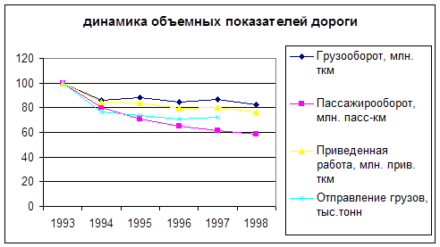 В последние годы на дороге происходит падение объемов работы, о чем говорят данные табл.2.2. Падение же объемов работы приводит к увеличению себестоимости транспортной продукции, что находит отражение в увеличении тарифов. А это в свою очередь стимулирует дальнейшее сокращение перевозок. В свою очередь наблюдается падение пассажирооборота более быстрыми темпами, чем грузооборота. Это влияет на структуру приведенной работы. Происходящее изменение в структуре приведенной работы имеет для дороги большое экономическое значение. Дело в том, что грузовые перевозки на сегодняшний день достаточно рентабельны, а доходы от пассажирских перевозок не покрывают связанные с ними расходы. Таким образом, снижение доли пассажирских перевозок в общем объеме работы, способствует улучшению финансового положения дороги. Важнейшим условием совершенствования пассажирских перевозок является сокращение времени, затрачиваемого пассажиром на поездку, основным параметром здесь выступает повышение скорости движения. На октябрьской дороге уже преодолен барьер в 200 км/ч – на напрвлении Санкт-Петербург – Москва с марта 1984 г. постоянно курсирует электропоезд ЭР-200. Таблица 2.2.Динамика Объемных показателей на N-ской железной дороге