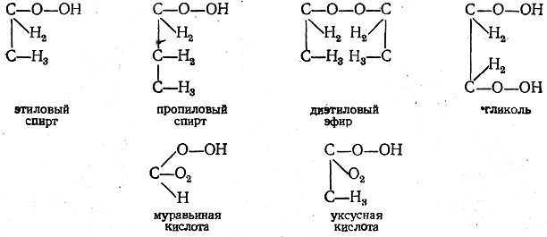 Таким образом, взгляды Купера, развитые им в его талантливой, интересной работе, не носят характера строгой теории. 1.3. Конституционные формулы Лошмидта Другая попытка изображения органических соединений конституционными формулами была сделана в 1861 г. Лошмидтом. При построении своих формул Лошмидт рассматривал атомы как мельчайшие материальные частицы, подвергающиеся действию сил притяжения и отталкивания. Эти силы при сближении атомов уравновешиваются, и различные атомы удерживаются друг около друга в некотором равновесном положении. Сферы действия атомных сил Лошмидт условно обозначал кружками (например, атомы углерода и водорода — простыми кружками, кислорода—двойными, азота—тройными). Формулы Лошмидта имели следующий вид: