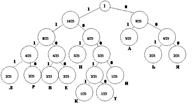 Таким образом, двигаясь по кодовому дереву сверху вниз, можно записать для каждой буквы соответствующую ей кодовую комбинацию: А – 10, Ь – 100, Я – 000, Л – 1111, Р – 0111, В – 1011, Е – 0011, Н – 101, К – 11001, Т – 01001, И – 0001. |