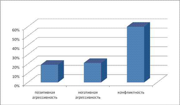Интерпретация результатов Сумма баллов по шкалам «напористость» и «неуступчивость» дает суммарный показатель позитивной агрессивности субъекта. Сумма баллов, набранная по шкалам «нетерпимость к мнению других» и «мстительность», дает показатель негативной агрессивности субъекта. Сумма баллов по шкалам «бескомпромиссность», «вспыльчивость», «обидчивость», «подозрительность» дает обобщенный показатель конфликтности. В результате получили следующие результаты: - показатель позитивной агрессивности субъекта – 19% - показатель негативной агрессивности субъекта – 21% - показатель конфликтности – 60%