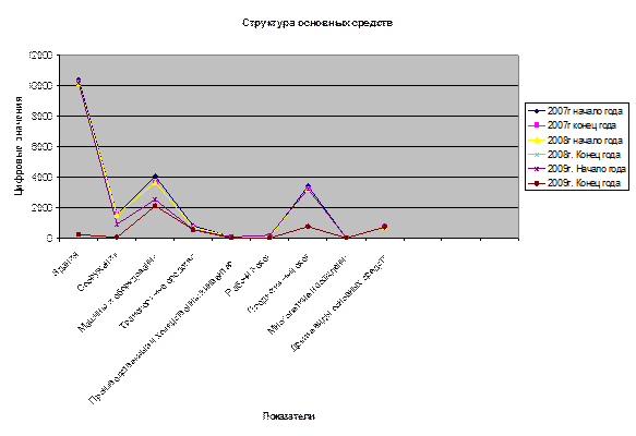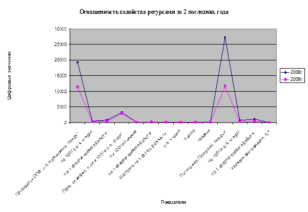 Наибольший удельный вес в стоимости основных средств составляют производственные основные средства. В течение 3х лет произошли изменения в структуре фондов, удельный вес производственных фондов снизился с 20366 до 3706 тыс.руб. (на 81,80%), а удельный вес зданий снизился с 10216 до 233 тыс.руб. (97,76%). Наблюдается понижение количества основных фондов за исследуемые три года, за исключением земельных участков и объектов природопользования, уровень которых составляет в течении трех лет 3938га, но в начале 2009г в зависимости от общего количества основных средств их удельный вес составил 21,48%, а к концу 2009г. уже 88,95%. Это ярко выраженное повышение структуры земельных участков отражено на фоне общего понижения уровня основных фондов всех остальных групп. Удельный вес продуктивного скота также в течении трех лет держится почти на одном уровне по отношению к общему количеству основных фондов – в среднем 16,67%, рабочий скот к концу 2009г. был полностью выведен. Структура основных средств представлена графически (График 2).