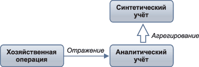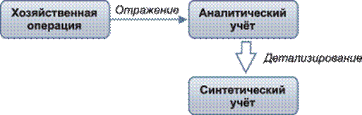 Рис. 2. Построение системы учета Такой метод построения учётной системы получил название «от частного к общему” – отражение данных в аналитических счетах с последующим обобщением на соответствующем синтетическом счёте. Такой подход характерен для некоторых систем, например, используется в «Инфо-Бухгалтере”. Но существует и другой способ построения – «от общего к частному”, когда производится обобщение данных в синтетическом счёте и их последующая детализация в аналитических счетах (рис. 3).