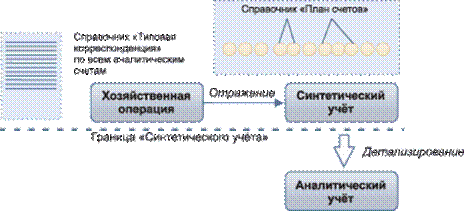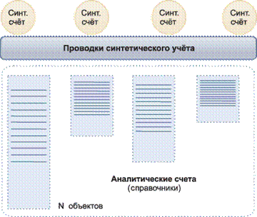 Наиболее важным следствием данных различий является заранее не известное будущее количество объектов аналитического учёта, которые окажутся привязанными к определённому синтетическому счёту (т. е. полная неопределённость). Поэтому для каждого синтетического счёта требуется предусмотреть такую неопределённость в схеме соответствия ему аналитических счётов (рис. 5).