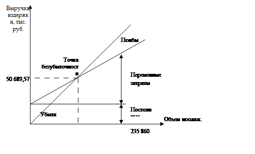 Сумма налога на имущество определяется по формуле: Ним = СТим · Сим = 139 100 · 2,2 =3 060,2, 100 100 где: СТим – стоимость имущества, руб.; Сим – ставка налога на имущество предприятий и организаций, (2,2%) СТим = Ст оборудования, где Ст оборудования – стоимость оборудования, руб. Точка самоокупаемости = Постоянные издержки = 369 833,2 = 14 008. Ср.цена _ Удельные 28,15 – 1,75 Таблица 2.9.3 – Расчет издержек производства