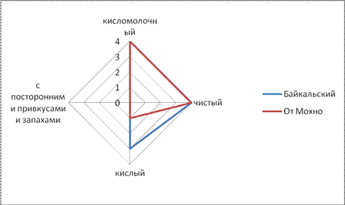 В результате проведенного микробиологического анализа видно, что БГКП не обнаружены во всех трех образцах, что соответствует норме. КМАФАнМ вообще не присутствуют в твороге «Байкальский», а в твороге «От Мохно» превышают норму. По содержанию дрожжей и плесеней все образцы удовлетворяют требованиям технического регламента. 2.4.2.Сравнительный сенсорный анализ творога с использованием профильного метода. Профильный метод основан на том, что отдельные импульсы вкуса, запаха и консистенции, объединяясь, дают качественно новый импульс общей сенсорной характеристики творожных изделий. Алгоритм проведения сенсорной экспертизы профильным методом следующий: · составление номенклатуры характерных признаков для продукта; · определение порядка проявления отдельных признаков; · оценка интенсивности проявления отдельного признака; · построение профилей продукта по отдельным показателям; · составления заключения о качестве продукта. Для того чтобы составить номенклатуру характерных признаков творожных изделий следует выбрать более значимые из органолептических показателей качества и выделить характерные признаки для каждого из них. Оформим в виде таблицы 7. Таблица 7 - Характерные признаки качества