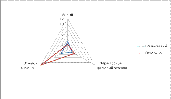 По полученным данным построим профили для каждого образца по каждому показателю. Для построения профилей, от центра окружности откладываем радиальные линии. Количество линий равно числу исследуемых параметров. На линии откладываются отрезки, соответствующие средним арифметическим значениям оценок интенсивности различных параметров, соединив полученные точки, получается профиль. Профиль вкуса и запаха Профиль цвета