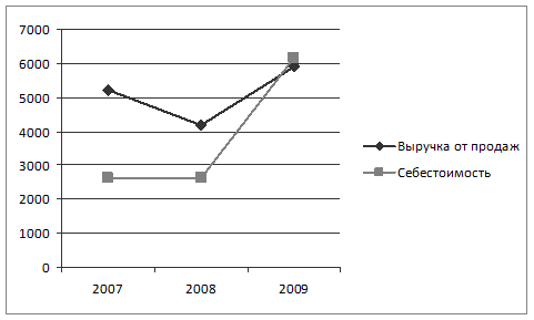 Рис. 1. Динамика выручки и затрат Анализ производительности труда и фондоотдачи (табл. 6) показывает, что производительность труда за 2009 год по сравнению с 2007 годом упала, а фондоотдача неуклонно растет. Таблица 6 Анализ деловой активности