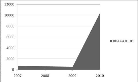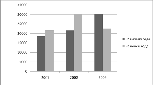 Рис.3. Динамика валюты баланса (Стоимость активов, тыс. руб) Анализ динамики валюты баланса показывает, что активы компании «Аэровип» выросли за период c2007 года по 2008 год, и упали за период 2008-2009 гг. Внеоборотные активы предприятия – это основные средства (здания, сооружения, оборудование), их стоимость в балансе возросла за 2009 год и составила на 1.01.2010 г. 10456 тыс. руб.