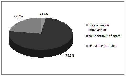 Рис. 9. Анализ пассивов Анализ источников собственных средств По данным отчетности источниками собственных средств фирмы «Аэровип» по состоянию на 31.12.2009 являются: • уставный капитал с учетом добавочного капитала - 708 тыс. руб.; • нераспределенная прибыль отчетного года – 6026 тыс. руб.; В целом за рассматриваемый период произошло увеличение суммы собственного капитала 2,03 раза. Это связано с нарастанием убытков. Анализ структуры кредиторской задолженности Источником финансирования имущества предприятия, наряду с собственным капиталом, являются краткосрочные заемные средства. За рассматриваемые периоды фирма «Аэровип» использовала краткосрочные кредиты банка на сумму 1500 руб. В балансе отражены краткосрочные кредиты, основным источником заемного финансирования является кредиторская задолженность. Состав кредиторской задолженности приведен в табл. 13. Размер кредиторской задолженности фирмы «Аэровип» за рассматриваемый период увеличился на 132,9% (по среднегодовым данным), что свидетельствует о невыполнении в срок своих обязательств, об усилении финансовой неустойчивости предприятия и повышении рискованности. В структуре кредиторской задолженности преобладает задолженность по налогам и сборам – 75,3%. По сравнению с 2007 г. ее доля увеличилась за счет уменьшение доли задолжности перед прочими кредиторами. Таблица 13 Анализ кредиторской задолженности