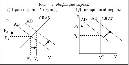 PM – равновесная рыночная цена, при которой спрос равен предложению. PG – цена, установленная государством. YS – величина совокупного выпуска (количество продукции, которое произведено и предложено к продаже производителями). YD – величина совокупного спроса (количество продукции, которую хотели бы купить потребители). Разница между YD и YS есть не что иное, как дефицит. Главная форма проявления скрытой инфляции – дефицит товаров. Дефицит служит формой проявления инфляции, поскольку одной из характерных черт инфляции является снижение покупательной способности денег. Дефицит означает, что деньги вообще не обладают покупательной способностью, поскольку человек не может на них ничего купить. 3. Причины инфляции и её проявления Выделяют две основные причины инфляции: 1) увеличение совокупного спроса; 2) сокращение совокупного предложения. В соответствии с причиной, обусловившей рост общего уровня цен, различают два типа инфляции: инфляцию спроса и инфляцию издержек. Если причиной инфляции служит рост совокупного спроса, то такой тип называется инфляцией спроса. Рост совокупного спроса может быть вызван либо увеличением любого из компонентов совокупных расходов (потребительских, инвестиционных, государственных и чистого экспорта), либо увеличением предложения денег. Основной причиной инфляции спроса большинство экономистов (особенно представители школы монетаризма) считают увеличение денежной массы (предложения денег), приходя к этому выводу из анализа уравнения количественной теории денег (также называемого уравнением обмена или уравнением Фишера). Как отмечал глава монетаризма, известный американский экономист, лауреат Нобелевской премии Милтон Фридман: «Инфляция всегда и повсеместно есть чисто денежное явление». Вспомним уравнение количественной теории денег: M*V = P*Y, где M – номинальное предложение денег (масса денег в обращении). V – скорость обращения денег (величина, которая показывает, сколько оборотов в среднем в год делает одна денежная единица). Например, 1 рубль, 1 доллар и т.п. или какое количество сделок в среднем в год обслуживает одна денежная единица, P – уровень цен и Y – реальный выпуск (реальный ВВП). Произведение уровня цен на величину реального выпуска (P * Y) представляет собой величину номинального выпуска (номинального ВВП). Скорость обращения денег практически не меняется и обычно считается величиной постоянной, поэтому увеличение предложения денег, т.е. рост левой части уравнения, ведёт к росту правой его части. Рост денежной массы ведёт к росту уровня цен и в краткосрочном периоде (поскольку в соответствии с современными представлениями кривая совокупного предложения имеет положительный наклон) (рис . 2.(а)) , и в долгосрочном периоде (которому соответствует вертикальная кривая совокупного предложения) (рис. 2.(б)) . При этом в краткосрочном периоде инфляция сочетается с ростом реального выпуска, а в долгосрочном периоде реальный выпуск не меняется и находится на своем естественном (потенциальном) уровне.