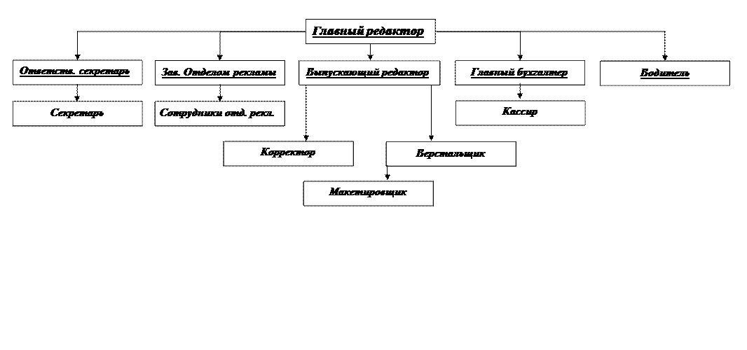 - Имеющиеся ресурсы. Руководитель предприятия (он же является Главным редактором)- главная функция которого принимать главные управленческие решения по различным вопросам. Решение о найме и увольнении персонала. Привлечение авторов для написание статей, печатаемых в издании, их предвыпускное редактирование, и подпись материалов в печать; Выпускающий редактор – осуществляет контроль за верткой издания и рекламных макетов, производит основное редактирование материала; Главный бухгалтер предприятия – Основной функцией данного работника является: ведение бухгалтерского учёта на предприятии, распределение средств Кассир – основной функцией данного работника является выдача заработной платы и денег на приобретения расходных материалов сотрудникам редакции, контроль за правильностью заполнения расходных и приходных кассовых ордеров; Ответственный секретарь – выполняет функции делопроизводителя, координирует работу секретаря; Секретарь – осуществляют набор текстов на компьютере, прием звонков, отправку почты, мелкие поручения; Корреспонденты – осуществляют поиск и написание материалов для очередного выпуска; Корректор – осуществляет корректирование материалов подписанных в номер; Верстальщик – осуществляет компьютерную вёрстку; Макетировщик – осуществляет вёрстку рекламных макетов; Заведующий отделом рекламы – осуществляет координацию работы сотрудников рекламного отдела, заключает договора с рекламодателями и спонсорами; Работники рекламного отдела – осуществляют поиск рекламодателей и обсуждение с ними подачи модуля в газету; Водитель – обеспечивает содержание редакционного транспорта в надлежащем состоянии и доставляет сотрудников редакции до места назначения. Ресурсы здания и сооружения редакции, энергетические ресурсы, финансовые ресурсы, технические ресурсы, ЭВМ, канцелярские ресурсы, информационные ресурсы, сырьевые ресурсы. 2. Закон развития организации. Любая организация стремится с положительными результами используют для этого свои ресурсы и возможности. Данная организация нормально развивается. У нее масса возможностей и хорошие тенденции развития. Если вдруг происходит какое-либо изменение внешней среды и требуется новая услуга или изменение старой данная организация без проблем, больших усилий и больших затрат она заменит или внедрит что-то новое. Рассмотрим это на некоторых принципах: 1. Принцип неприрывности – без изменения нет развития организации. Внешняя среда постоянно меняется и вкусы потребителей на различные услуги тоже меняются, поэтому организация как уже было сказано выше легко и свободно сможет внедрить что-то новое, потому что она будет первой в Челябинской области на рынке т.к. может достигнуть предела своих возможностей, т.е. пока находится в фазе роста (потому что происходит внедрение чего-то нового в зависимости от потребностей клиентов). Данная компания находится на стадии неприрывности так как постоянно Подстраивается под потребности клиента. 2. Принцип инерции – положительные результаты развития должны сохраняться и использоваться достаточное время. В данной организации этот принцип выполняется, создав что-то новое она старается как можно дольше это удержать и использовать. Например : Размещение бесплатных частных объявлений, что помогает более 