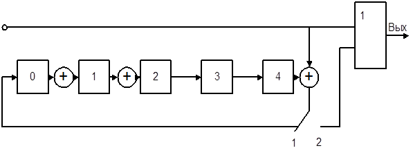 e=10.06+3.92=13.98% Pош1 =0.5(1-Ф((50+13.98)/24,5))=0.25233 Pош1 =0.5(1-Ф((50-13.98)/24,5))=0.2834 Pош =0.53573 Глава 3. Кодирование в системах ПДС Задача1. Нарисовать кодер циклического кода, для которого производящий полином равен (2N+1)=39 Дано: N=39 Решение: P(X)=39=[100111]=Х5 +X2 +Х+1 Схема кодера: