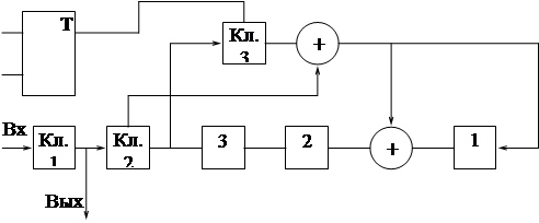 S=log2 m=4 fзг =B*2S =1190*16=19040 Гц. Задача 3. Рассчитать параметры устройства синхронизации без непосредственного воздействия на частоту задающего генератора со следующими характеристиками: время синхронизации не более 1с., время поддержания синфазности не менее 10с., погрешность синхронизации не более 10% единичного интервала. Среднеквадратическое значение краевых искажений равно 10%, исправляющая способность приемника 45%, коэффициент нестабильности генератора k=10-6 . Скорость модуляции для своего варианта рассчитывается по формуле B=(600+10N) Бод, где N - номер варианта. Дано: tс <=1c., tпс .>=10c., e<=10%, sкр .=10%, m=45%, k=10-6 , B=790 Бод. Решение: e=eст. + eдин. eст. =1/m+2kS*3=1/m+6kS