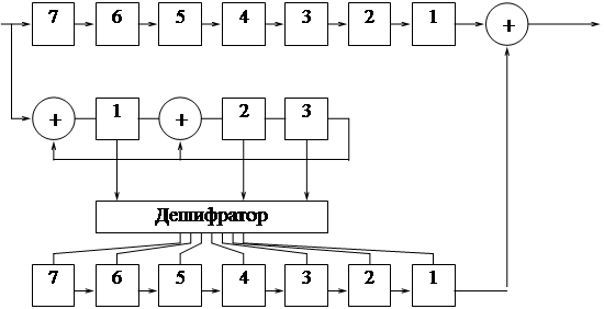 0 Задача 3. Нарисовать кодирующее и декодирующее устройство с обнаружением ошибок и пропустить через кодирующее устройство исходную кодовую комбинацию с целью формирования проверочных элементов. Кодирующее устройство: